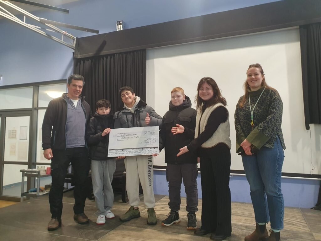 Mohammad Jarjanazi, Mohammed Al-Ajalan, Cem Habermann und Mahdi Haidari hatten eine Bewerbung bei dem FREI DAY Projektbooster von Schule in Aufbruch und Thalia Bücher eingereicht und einen Preis von 1000 Euro gewonnen, den Hanna Fietkenhauer von Schule im Aufbruch gestern übergab. Mit dem Geld möchte sich die Gruppe Gartenwerkzeug und ein Treibhaus kaufen, um ihr Projekt Schulgarten weiter voranzubringen. Die Jungs sind stolz und freuen sich über die Unterstützung.