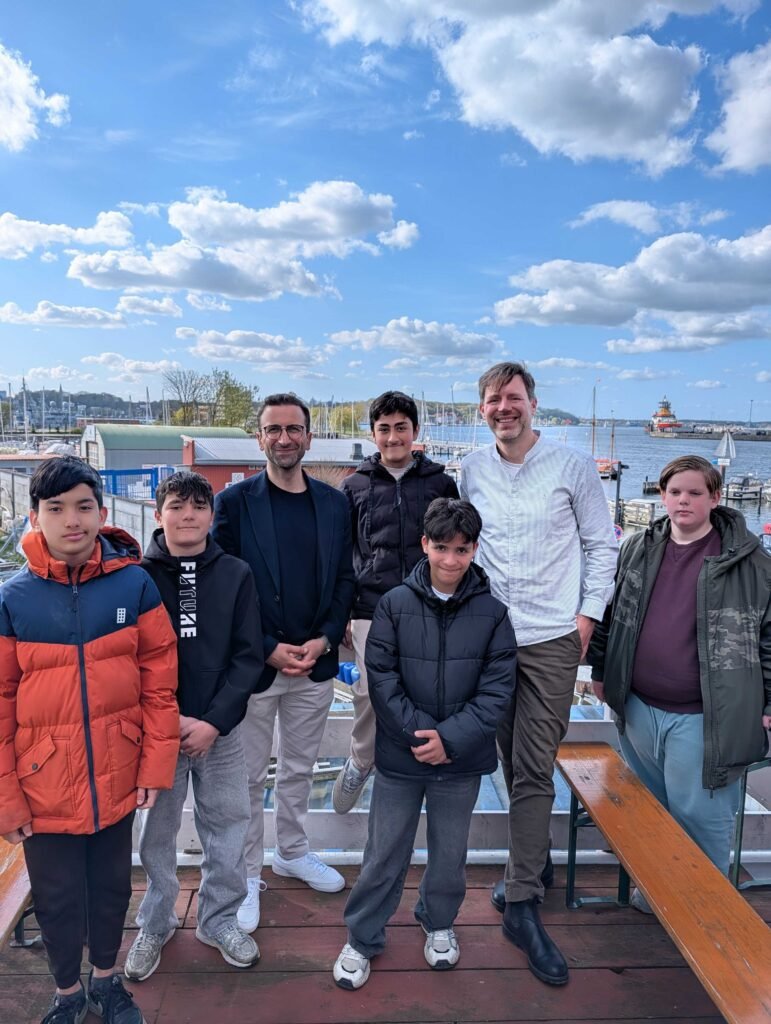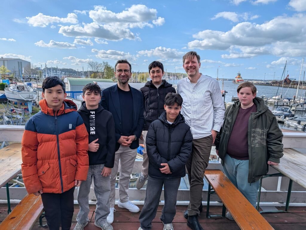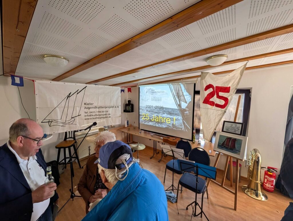 25 Jahre Jugendkutterverein – Die Jubiläumsfeier am Sonntag war ein sehr unterhaltsamer und schöner Nachmittag. Die Segel-AG trug zwei Seemannslieder zum Programm bei, was für die Jungs kein Problem war, da sie bei den gemeinsamen Turns abends auch regelmäßig singen. Sie performten richtig toll vor dem großen Publikum und den berühmten Gästen. Außerdem wurde viel aus der reichhaltigen Geschichte des Jugendkutterprojekts erzählt. Sogar der Kieler Oberbürgermeister Samet Yilmaz war zu Gast und nahm sich viel Zeit für unsere Schüler. Sie durften ihm ein paar Fragen stellen, die er mit Leichtigkeit und Humor beantwortete. Das war für die Jungs ein besonderer Moment. Auch von unserem Projektlernformat FREI DAY hatte er schon gehört und fand das Schrebergarten-Projekt der Gruppe sehr gut. Er war früher bei uns auf der Schule und freute sich sehr, neue Geschichten seiner alten Schule zu hören. Am Ender durfte das gemeinsame Selfie natürlich nicht fehlen.
